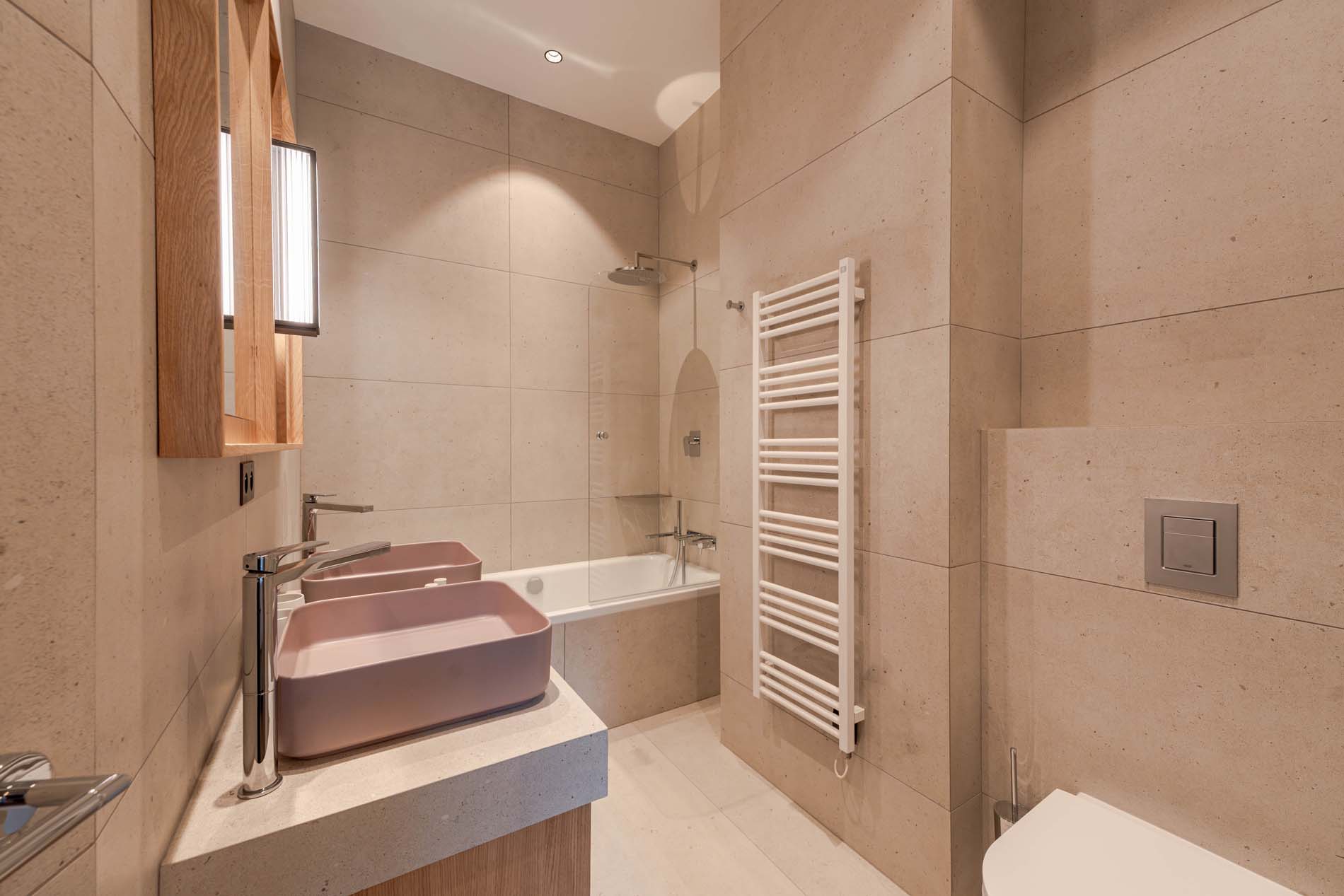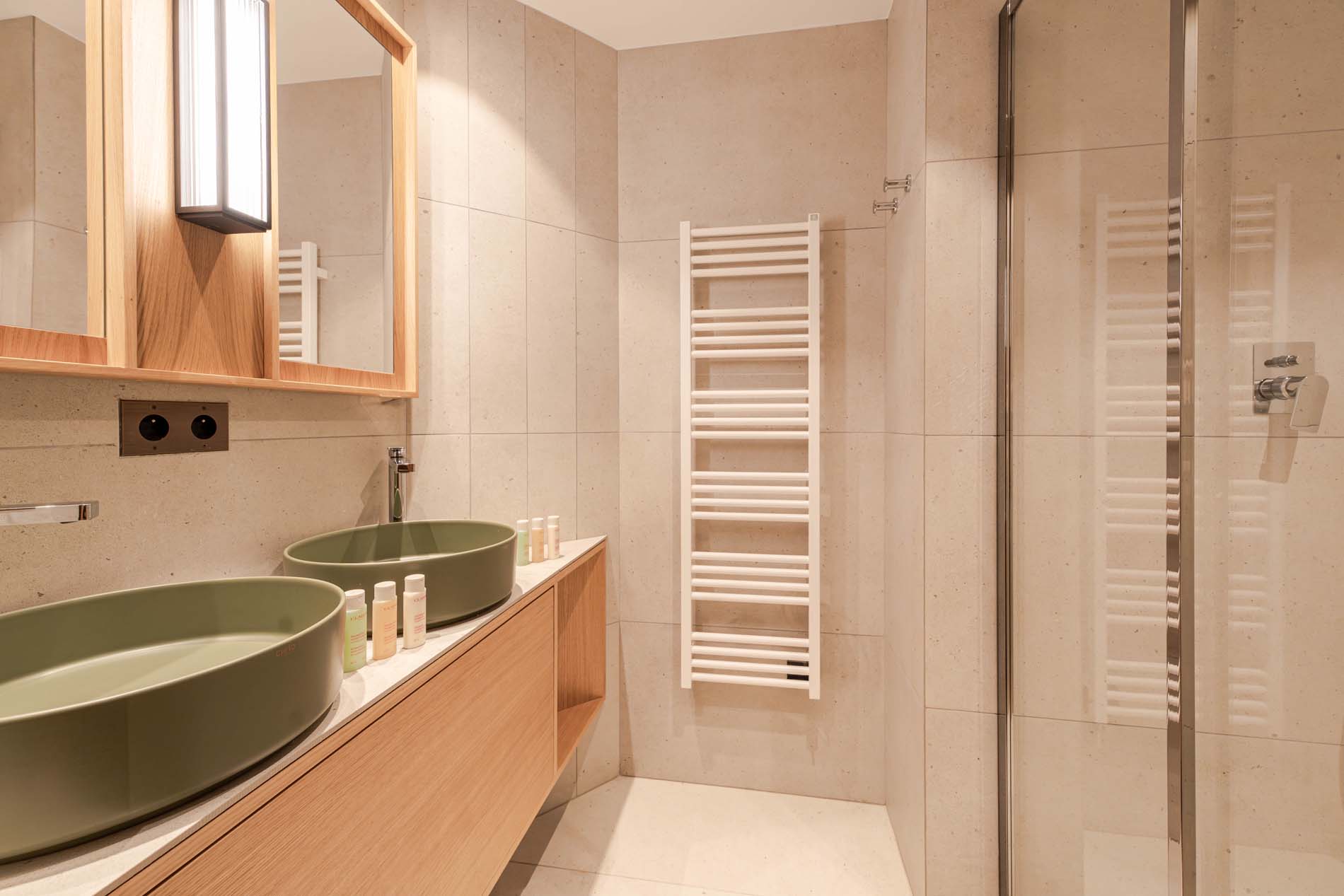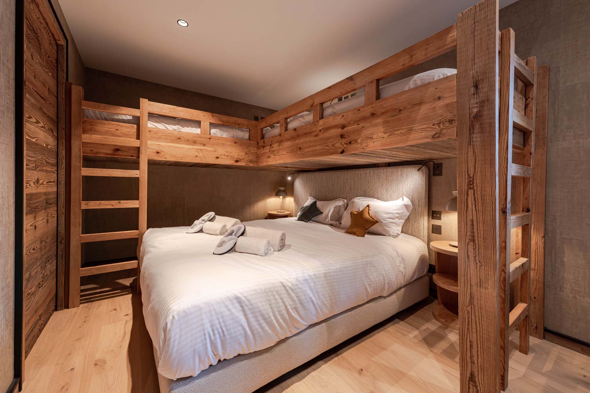 Bedroom 2: Twin/double bed, additional bunk beds, and en-suite bathroom with shower and double vanity.