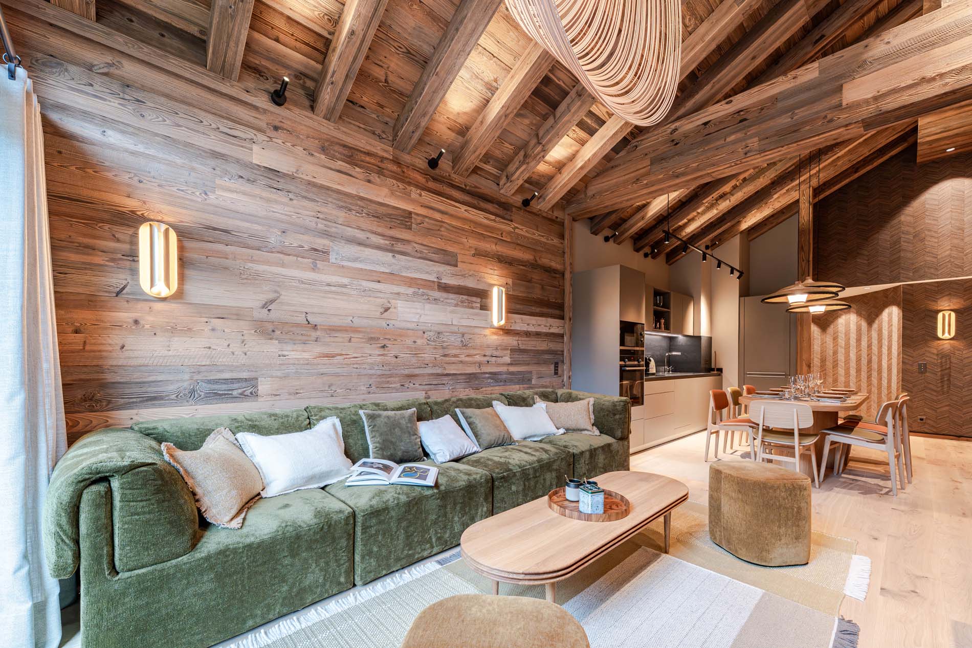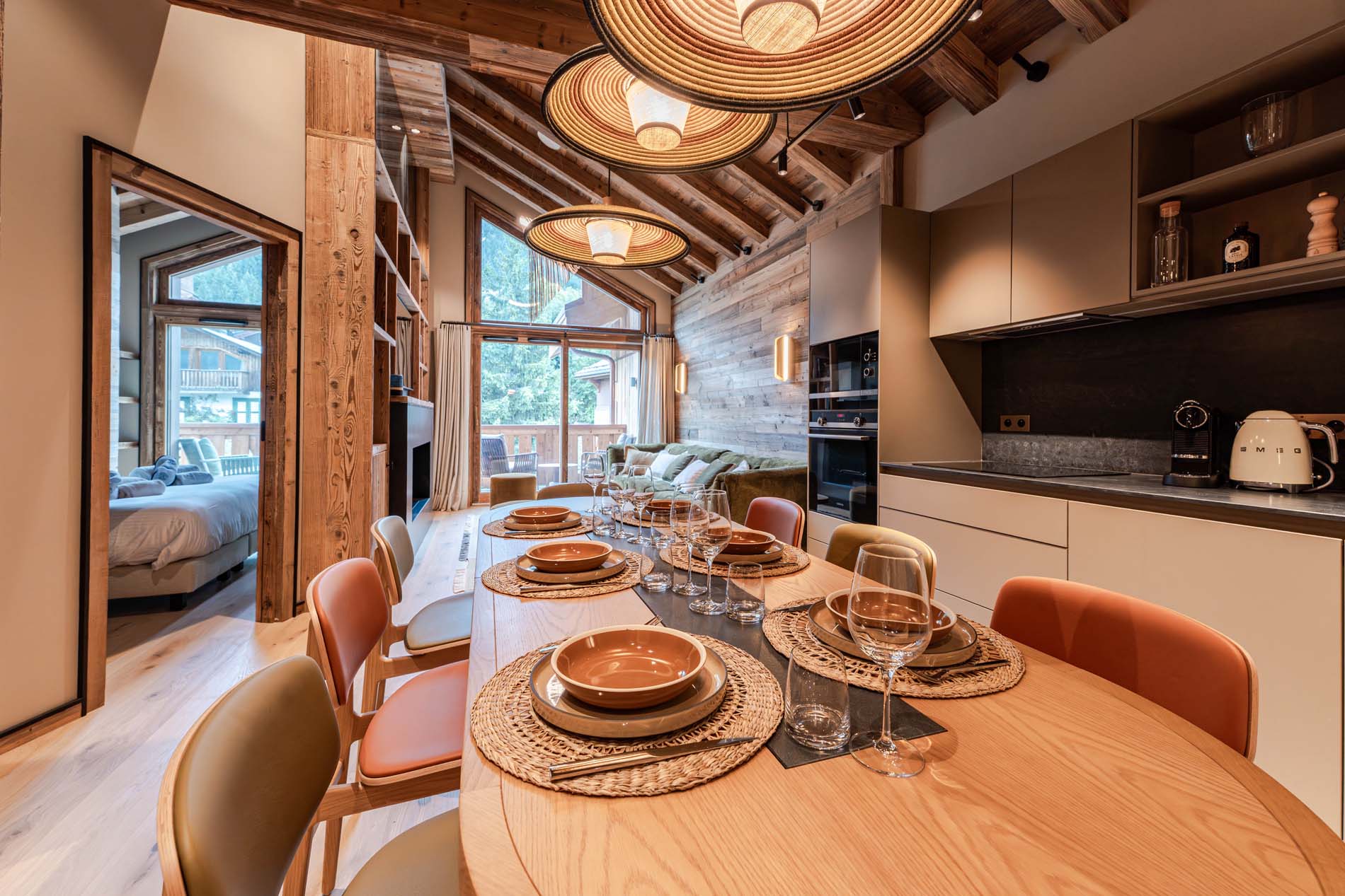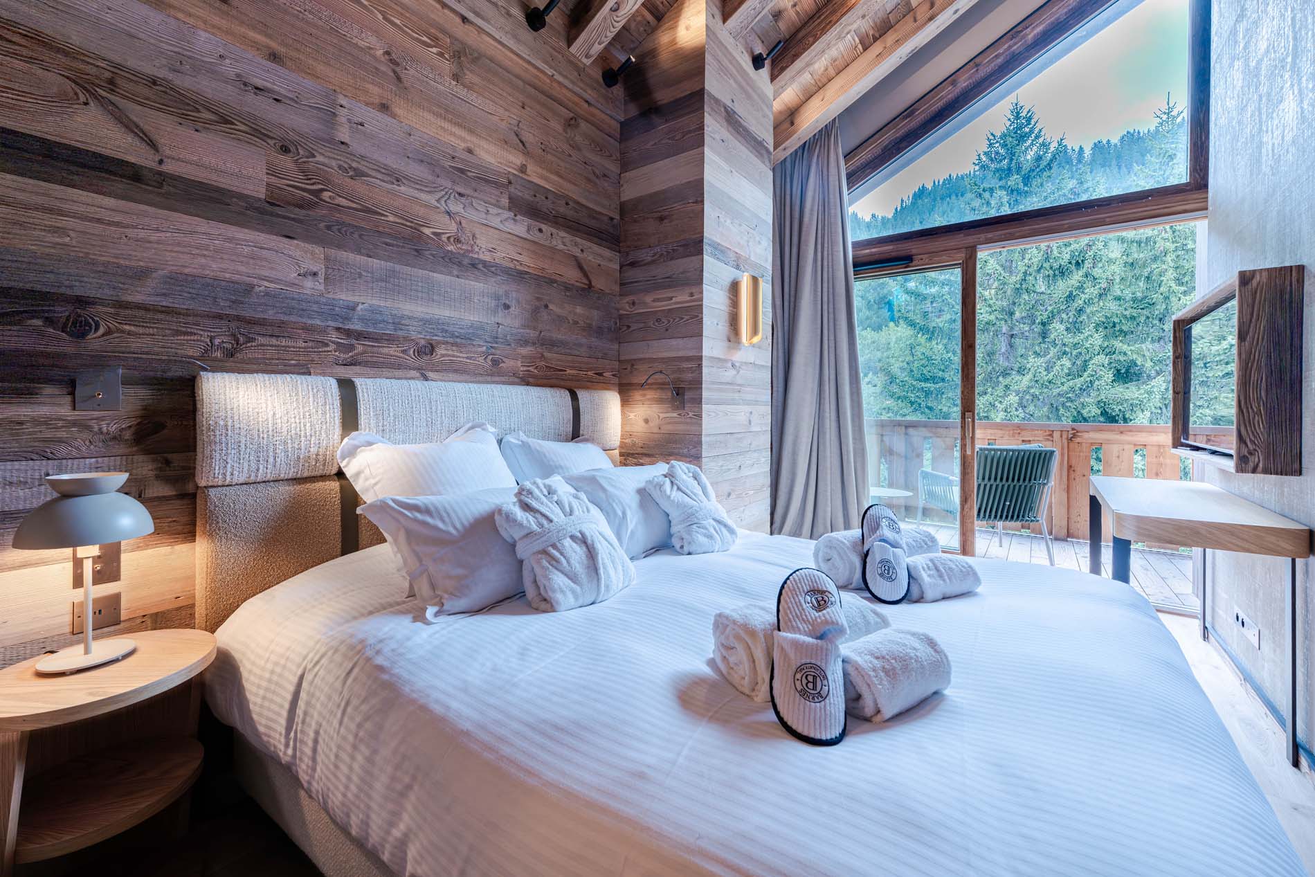 Bedroom 2: Twin/double bed, additional bunk beds, and en-suite bathroom with shower and double vanity.