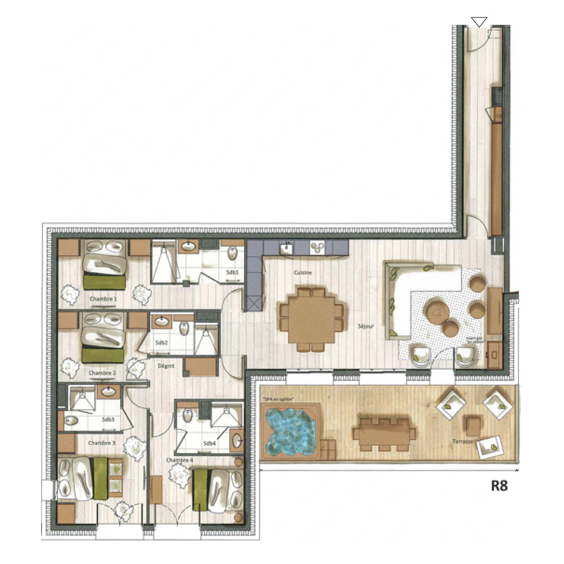 - Bedroom 4: Double bed, terrace and ensuite bathroom with shower, wash basin and WC.