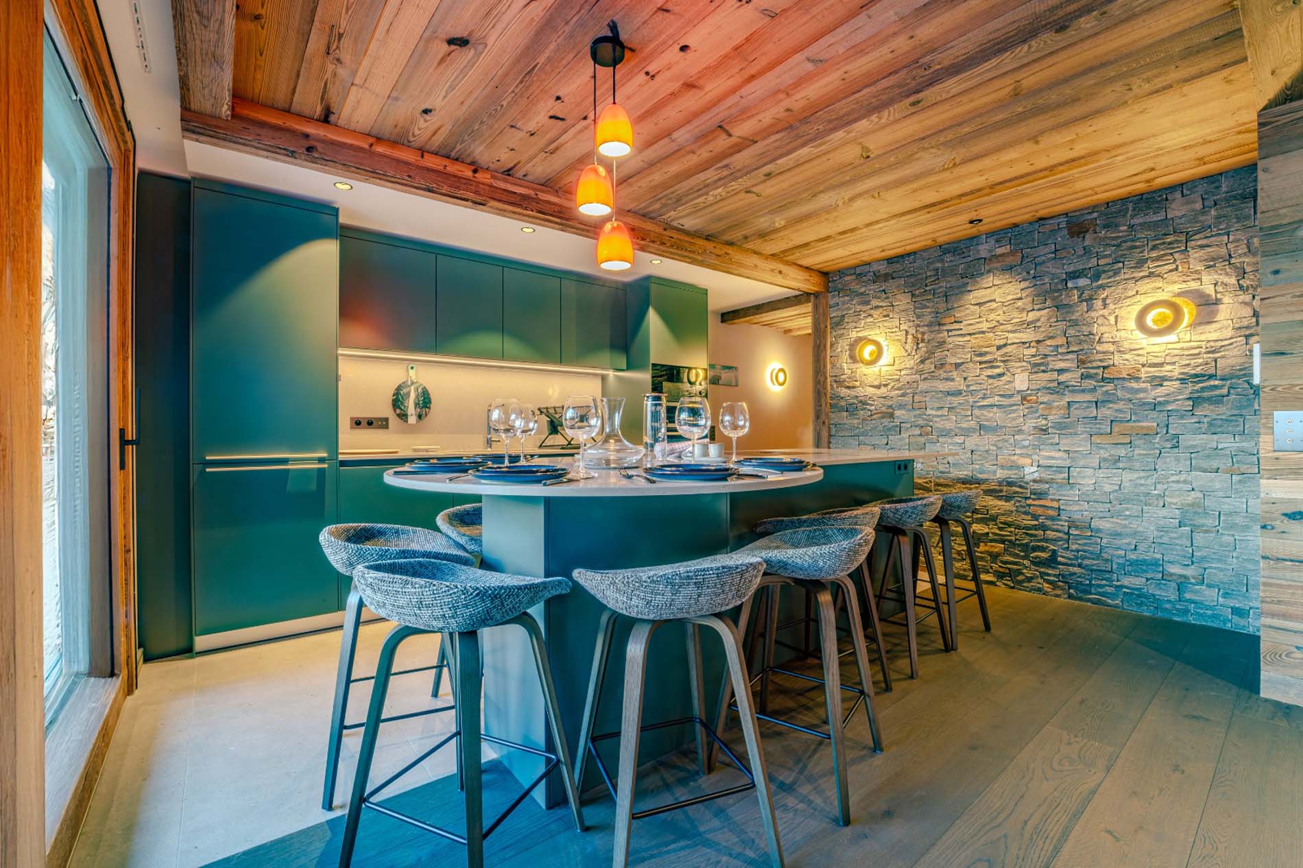 Fully fitted open kitchen with integrated dining table for 8 people