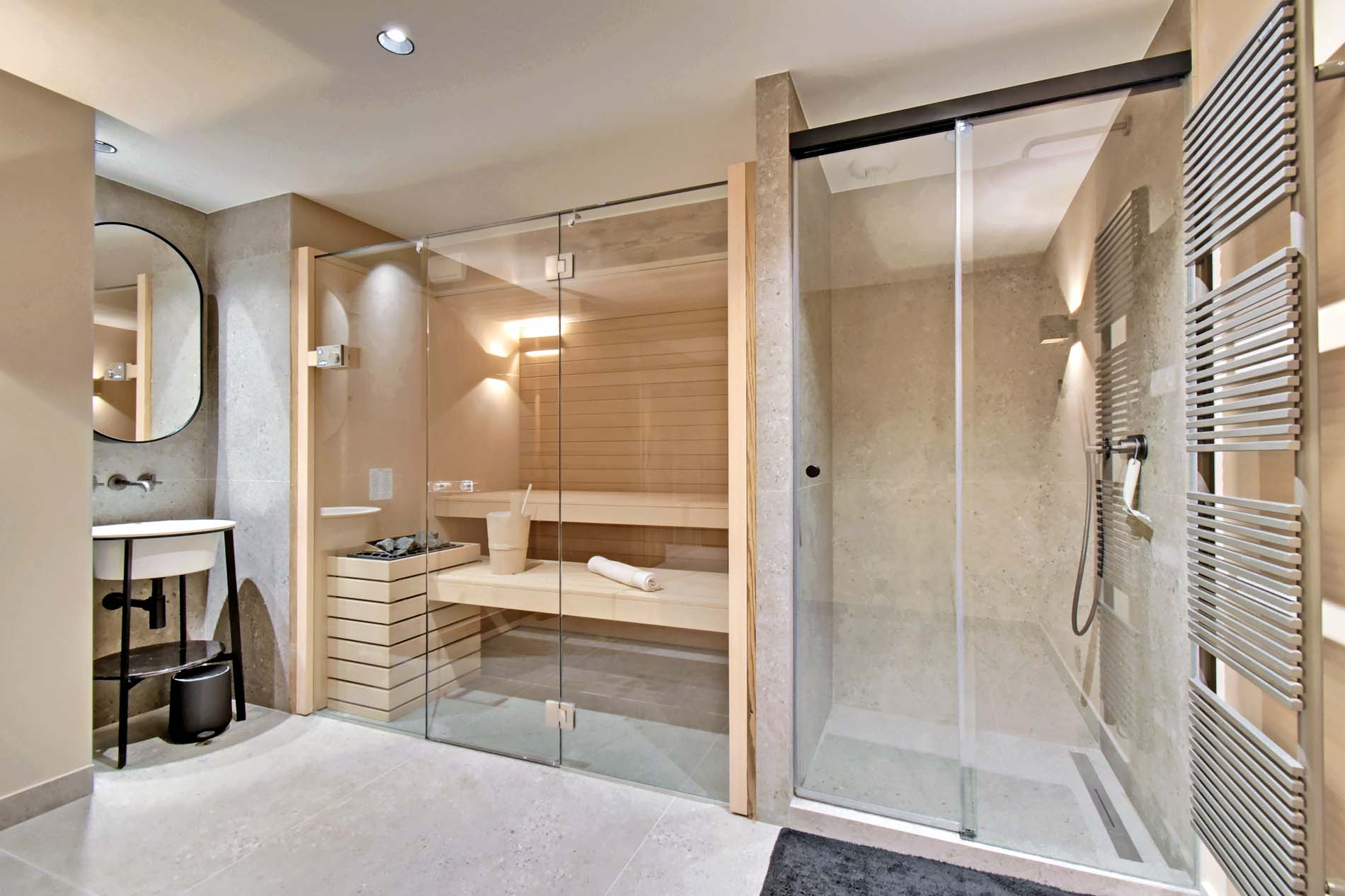 - Relaxation area with sauna, shower and washbasin.