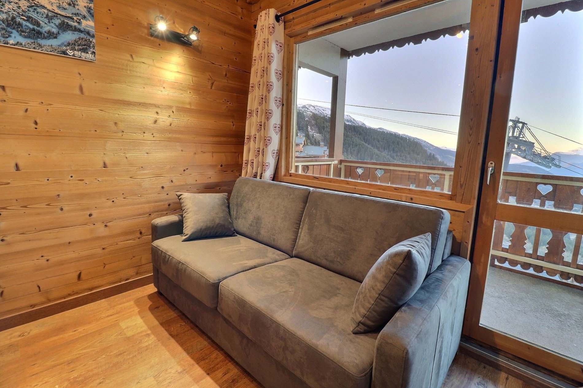 Living and dining room with sofa bed and balcony